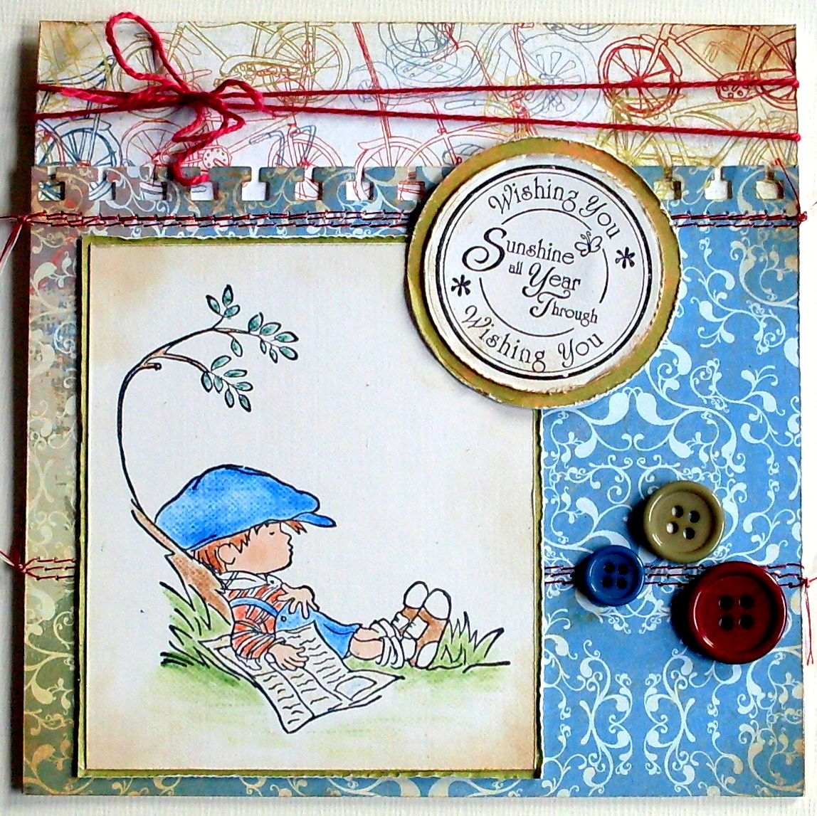 Little men - big men ... it never seems to be so easy to make cards for either! The card is based on a sketch from Mojo Monday. I used Basic Grey papers for covering the square white card. The top of the second layer has been punched with an EKSuccess punch and has been embellished with machine-sewn lines. The stamped images are from Lily of the Valley and coloured with Copics and Koh-i-noor pencils. Buttons and thread are from my stash. Wishing you all lots of sunshine!