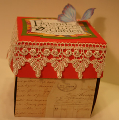 The entire box is made with double-sided cardstock. Around the top is a piece of lace I bought a while back and now I wish I had a couple of spools of it. I just love the way it looks around the top of things.